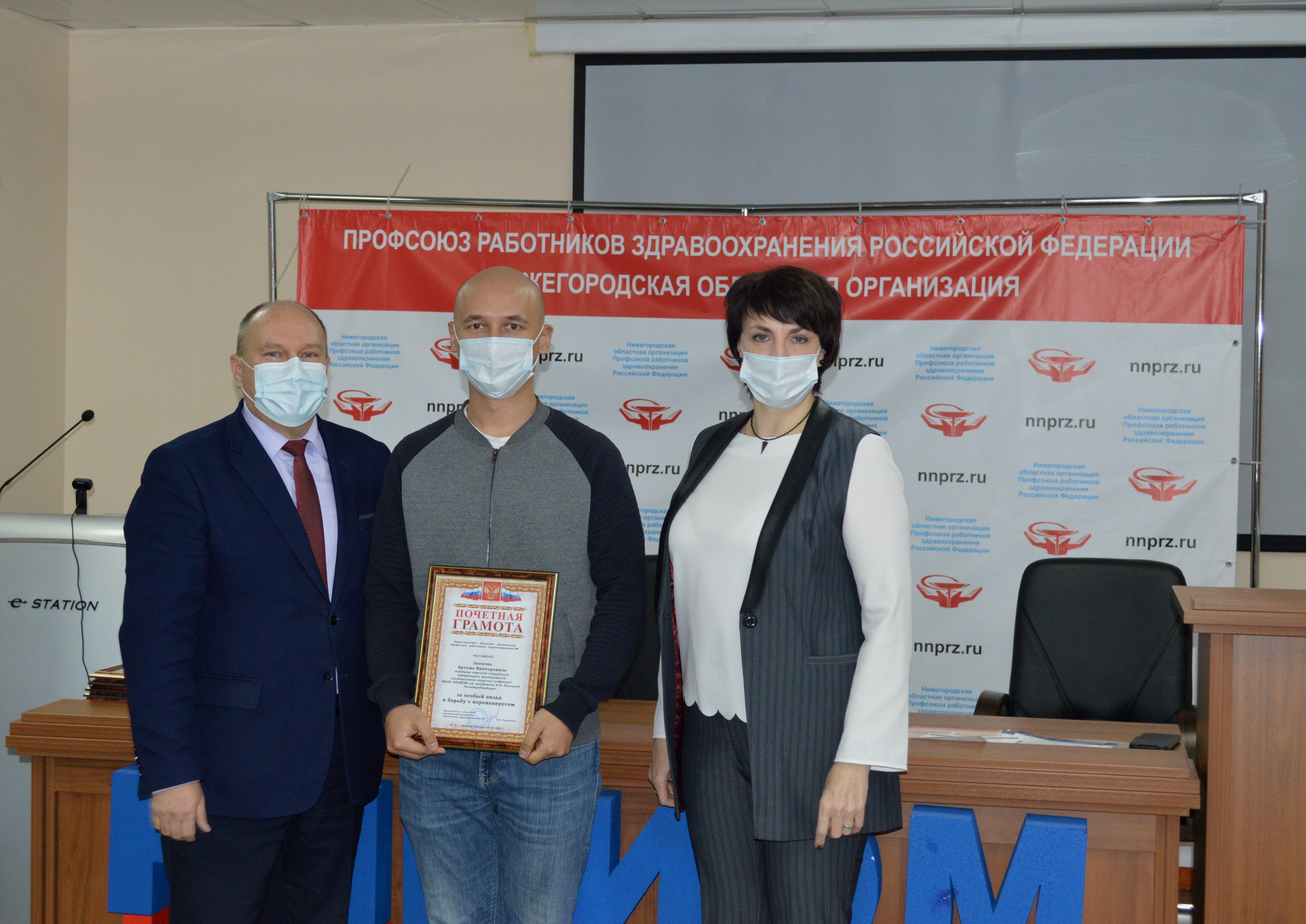 Председатель Нижегородского областной организации профсоюза работников здравоохранения РФ Василий Николаевич Приказнов вручил Почетные грамоты областного комитета и медали ЦК профсоюза «За особый вклад в борьбу с коронавирусом» сотрудникам института, отличившимся в борьбе с пандемией.